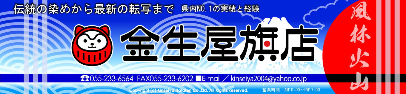 全国各地からのご注文承っております。最新の昇華転写技術から伝統の染物まで~のぼり旗、横断幕、祭半天・法被・暖簾、神社寺院幟幕の製作は金生屋旗店におまかせあれ!