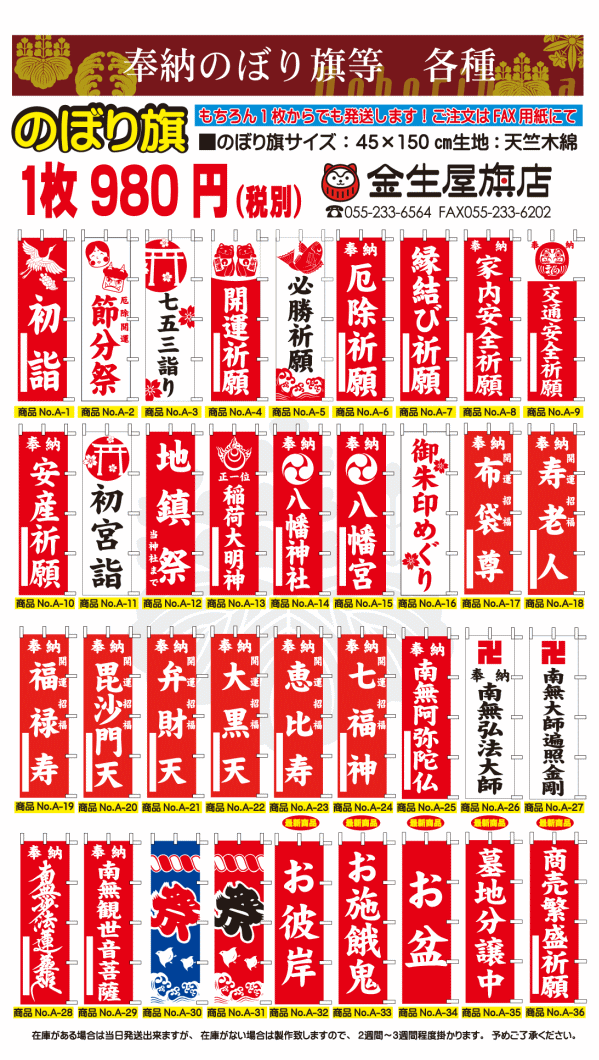神社既成のぼり旗・幟旗寺院既成幟旗・初詣、節分祭、七五三詣り、開運祈願、必勝祈願、家内安全、縁結び祈願、七福神、南無阿弥陀仏、南無妙法蓮華経、お施餓鬼、大黒天、恵比寿店、稲荷大明神、初宮詣、南無観世音菩薩、墓地分譲中